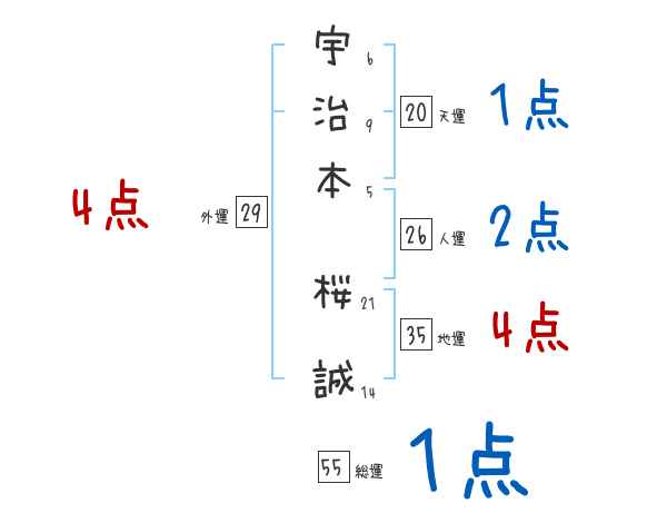 人運![]() | 宇治本桜誠さんの人運は26画の2つ星!波瀾万丈かも。信頼できる人を大事にしましょう。 性格や才能などを表す2番目に重要な運勢です。人間関係や協調性、社会的な成功に影響します。主に20歳から50歳ぐらいまでの中年期の運勢を表します。 |