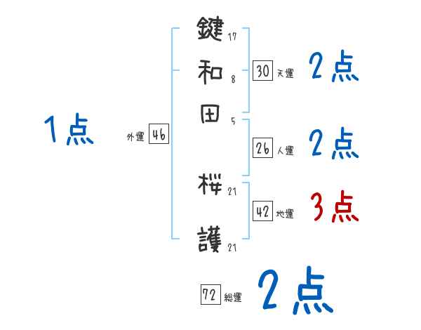 総運![]() | 鍵和田桜護さんの総運は72画の2つ星!災難が多く不安定な生活にならないように注意。明暗のある人生かも。 あなたの人生を表す1番重要な運勢です。生涯を通じて影響する総合運となり、主に50歳以降の晩年期に影響を及ぼします。 |