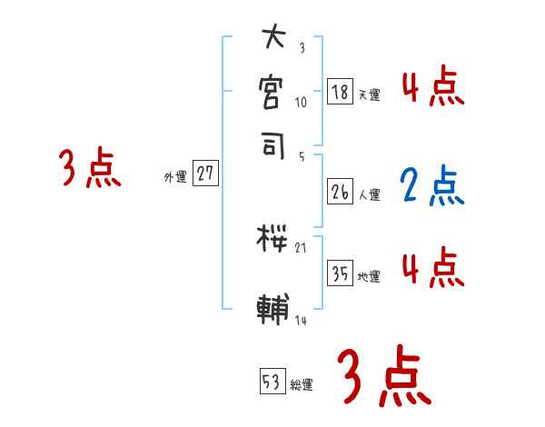 総運![]() | 大宮司桜輔さんの総運は53画の3つ星!やや見栄っ張りで虚栄心がある。散財に注意。 あなたの人生を表す1番重要な運勢です。生涯を通じて影響する総合運となり、主に50歳以降の晩年期に影響を及ぼします。 |