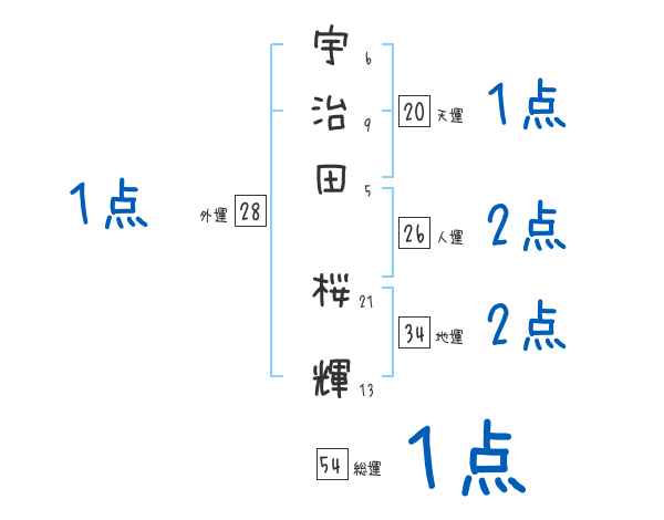 総運![]() | 宇治田桜輝さんの総運は54画の1つ星!トラブルが多いかも。周りをよく見て協調して過ごしましょう。 あなたの人生を表す1番重要な運勢です。生涯を通じて影響する総合運となり、主に50歳以降の晩年期に影響を及ぼします。 |