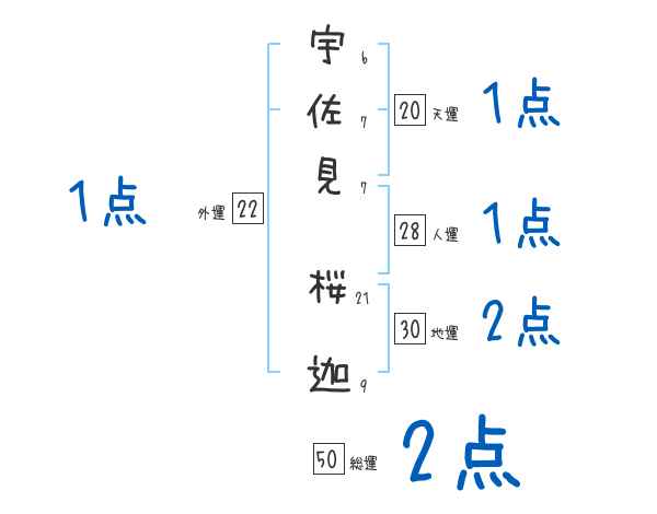 外運![]() | 宇佐見桜迦さんの外運は22画の1つ星!努力することが苦手ないっぽう手先が器用。芸術性にも優れる。 生活面を象徴する運勢です。外部から受ける影響力を表し、結婚運、家庭運や職場、環境への順応性を表します。 |