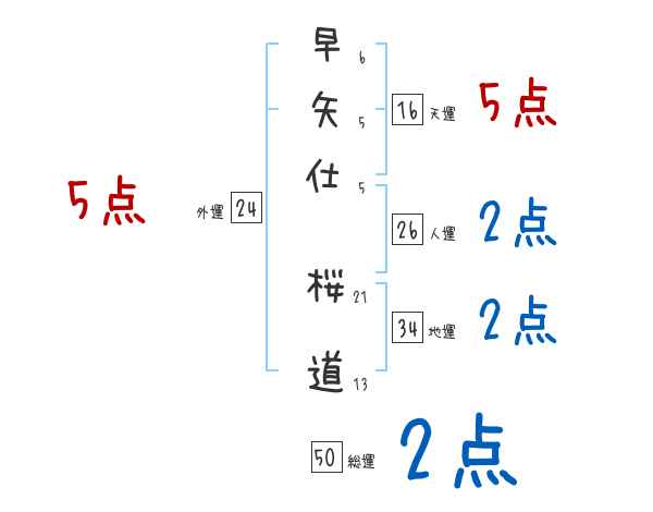 天運![]() | 早矢仕桜道さんの天運は16画の5つ星!人望が厚く大きく発展する。逆転成功が見える。 家系が持つ宿命的な運勢を表します。祖先から受け継いだ苗字ですので自分の力が及びません。家柄を象徴します。 |