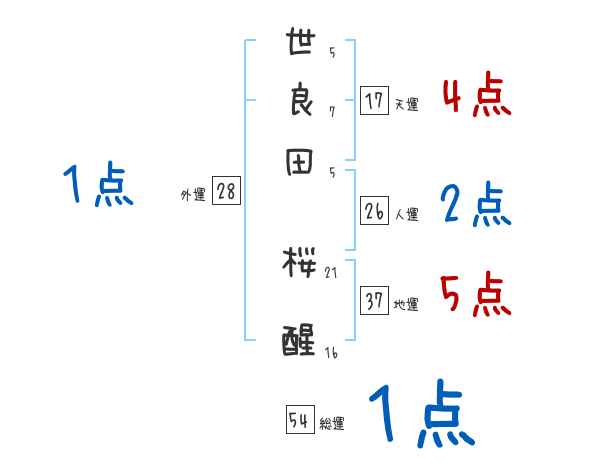 天運![]() | 世良田桜醒さんの天運は17画の4つ星!積極的な行動力。地位を気づき財産を手に入れる。純粋な心と直感力。 家系が持つ宿命的な運勢を表します。祖先から受け継いだ苗字ですので自分の力が及びません。家柄を象徴します。 |