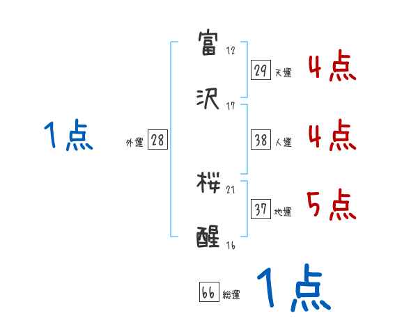 天運![]() | 富沢桜醒さんの天運は29画の4つ星!完全主義で才能がある。厳格な心の持ち主。 家系が持つ宿命的な運勢を表します。祖先から受け継いだ苗字ですので自分の力が及びません。家柄を象徴します。 |