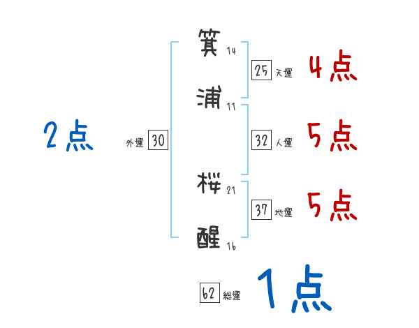 人運![]() | 箕浦桜醒さんの人運は32画の5つ星!柔軟性があり成功する。チャンスが多く金運が良い。 性格や才能などを表す2番目に重要な運勢です。人間関係や協調性、社会的な成功に影響します。主に20歳から50歳ぐらいまでの中年期の運勢を表します。 |