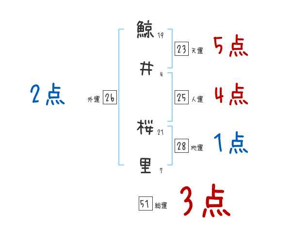 天運![]() | 鯨井桜里さんの天運は23画の5つ星!想像力に優れ活力がある。一代で成功し名誉を手に入れる。 家系が持つ宿命的な運勢を表します。祖先から受け継いだ苗字ですので自分の力が及びません。家柄を象徴します。 |