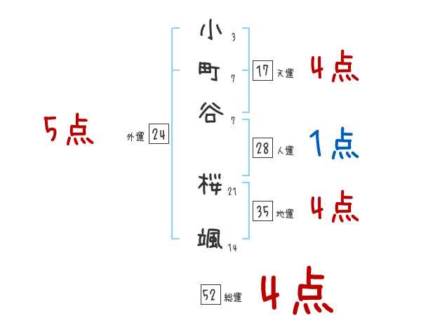 外運![]() | 小町谷桜颯さんの外運は24画の5つ星!家庭運が良く順調な人生。金運にも恵まれる。 生活面を象徴する運勢です。外部から受ける影響力を表し、結婚運、家庭運や職場、環境への順応性を表します。 |