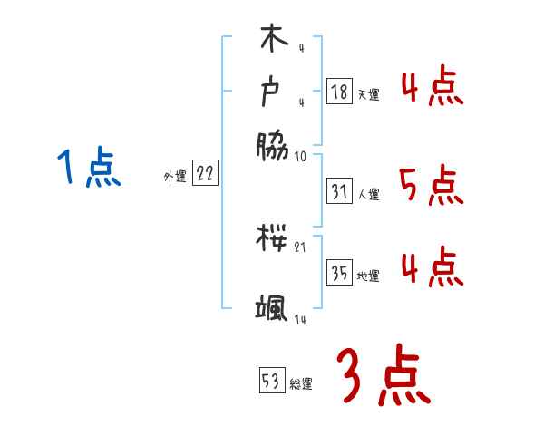 天運![]() | 木戸脇桜颯さんの天運は18画の4つ星!情熱的で剛気。忍耐力があり信頼される。 家系が持つ宿命的な運勢を表します。祖先から受け継いだ苗字ですので自分の力が及びません。家柄を象徴します。 |