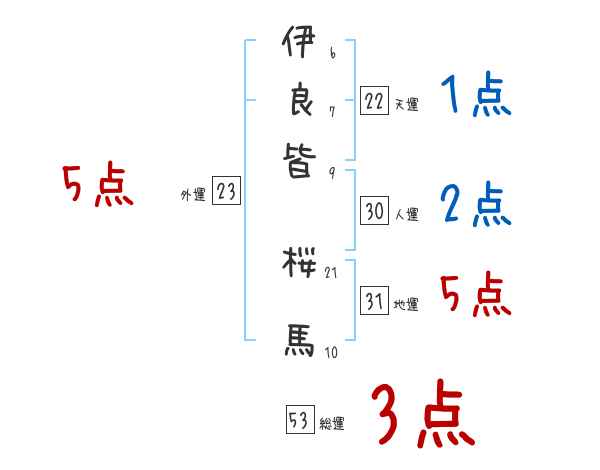 総運![]() | 伊良皆桜馬さんの総運は53画の3つ星!やや見栄っ張りで虚栄心がある。散財に注意。 あなたの人生を表す1番重要な運勢です。生涯を通じて影響する総合運となり、主に50歳以降の晩年期に影響を及ぼします。 |