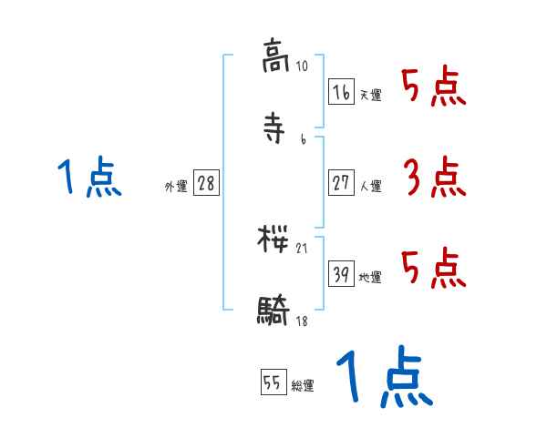 天運![]() | 高寺桜騎さんの天運は16画の5つ星!人望が厚く大きく発展する。逆転成功が見える。 家系が持つ宿命的な運勢を表します。祖先から受け継いだ苗字ですので自分の力が及びません。家柄を象徴します。 |