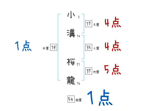 外運![]() | 小溝桜龍さんの外運は19画の1つ星!優れた才能を持ちますが、協調性が足りないことも。周りの人と協力する事を意識しましょう。 生活面を象徴する運勢です。外部から受ける影響力を表し、結婚運、家庭運や職場、環境への順応性を表します。 |