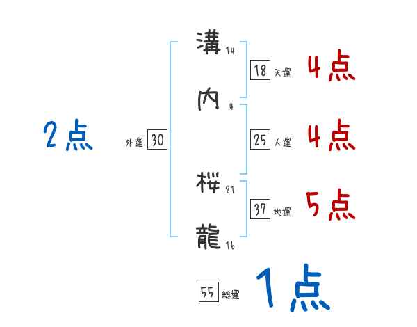 天運![]() | 溝内桜龍さんの天運は18画の4つ星!情熱的で剛気。忍耐力があり信頼される。 家系が持つ宿命的な運勢を表します。祖先から受け継いだ苗字ですので自分の力が及びません。家柄を象徴します。 |