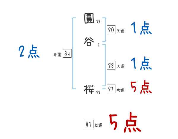 総運![]() | 圓谷桜さんの総運は41画の5つ星!大志を抱き、目標に向かって実力を発揮し達成する。温和な性格。 あなたの人生を表す1番重要な運勢です。生涯を通じて影響する総合運となり、主に50歳以降の晩年期に影響を及ぼします。 |