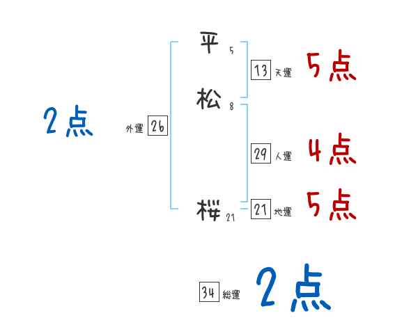 総運![]() | 平松桜さんの総運は34画の2つ星!独創性に優れるが、自尊心が強く災難に注意しましょう。 あなたの人生を表す1番重要な運勢です。生涯を通じて影響する総合運となり、主に50歳以降の晩年期に影響を及ぼします。 |