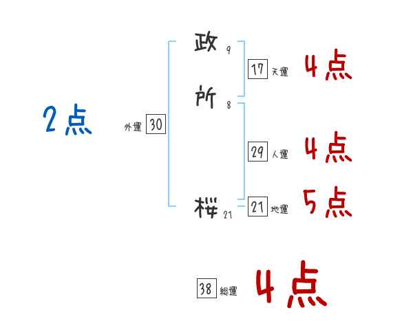 総運![]() | 政所桜さんの総運は38画の4つ星!温厚な性格で技術的な才能を発揮する。職人的な仕事に向いている。 あなたの人生を表す1番重要な運勢です。生涯を通じて影響する総合運となり、主に50歳以降の晩年期に影響を及ぼします。 |