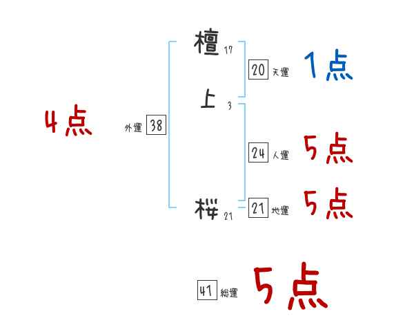 外運![]() | 檀上桜さんの外運は38画の4つ星!温厚な性格で技術的な才能を発揮する。職人的な仕事に向いている。 生活面を象徴する運勢です。外部から受ける影響力を表し、結婚運、家庭運や職場、環境への順応性を表します。 |