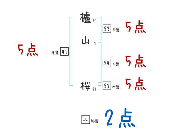 天運![]() | 櫨山桜さんの天運は23画の5つ星!想像力に優れ活力がある。一代で成功し名誉を手に入れる。 家系が持つ宿命的な運勢を表します。祖先から受け継いだ苗字ですので自分の力が及びません。家柄を象徴します。 |