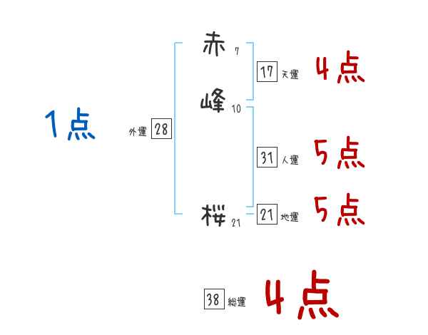 外運![]() | 赤峰桜さんの外運は28画の1つ星!家庭環境に注意。スポーツで活躍できる能力があるかも。 生活面を象徴する運勢です。外部から受ける影響力を表し、結婚運、家庭運や職場、環境への順応性を表します。 |