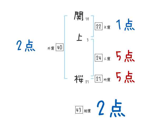 総運![]() | 関上桜さんの総運は43画の2つ星!頑固な性格で独立心が強いかも。やや非現実的で浪費に注意しましょう。 あなたの人生を表す1番重要な運勢です。生涯を通じて影響する総合運となり、主に50歳以降の晩年期に影響を及ぼします。 |