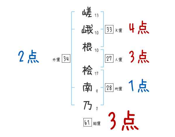 天運![]() | 嵯峨根桧南乃さんの天運は33画の4つ星!権力志向でプライドが高い。勇気があり運を切り開き成功する。 家系が持つ宿命的な運勢を表します。祖先から受け継いだ苗字ですので自分の力が及びません。家柄を象徴します。 |