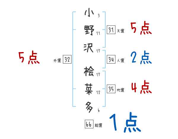 外運![]() | 小野沢桧菜多さんの外運は32画の5つ星!柔軟性があり成功する。チャンスが多く金運が良い。 生活面を象徴する運勢です。外部から受ける影響力を表し、結婚運、家庭運や職場、環境への順応性を表します。 |