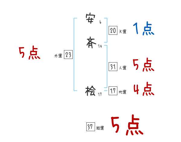 外運![]() | 安斉桧さんの外運は23画の5つ星!想像力に優れ活力がある。一代で成功し名誉を手に入れる。 生活面を象徴する運勢です。外部から受ける影響力を表し、結婚運、家庭運や職場、環境への順応性を表します。 |