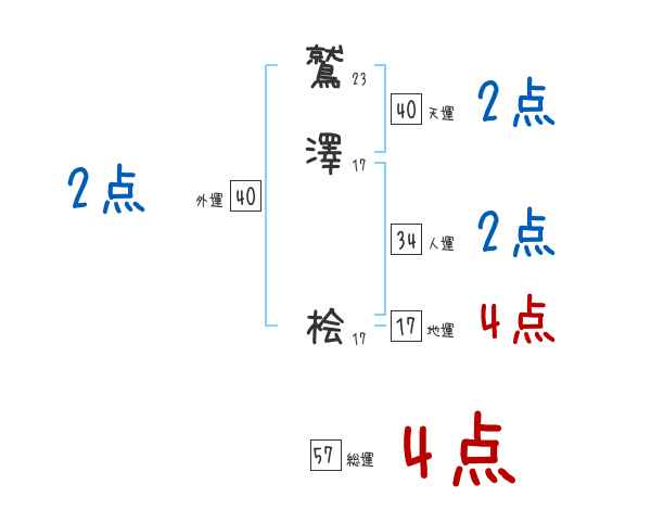 天運![]() | 鷲澤桧さんの天運は40画の2つ星!自信過剰で物事に固執するためトラブルに注意。 家系が持つ宿命的な運勢を表します。祖先から受け継いだ苗字ですので自分の力が及びません。家柄を象徴します。 |