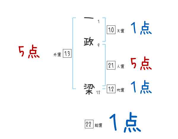 人運![]() | 一政梁さんの人運は21画の5つ星!統率力がある。独立し成功する。名誉を手に入れる。 性格や才能などを表す2番目に重要な運勢です。人間関係や協調性、社会的な成功に影響します。主に20歳から50歳ぐらいまでの中年期の運勢を表します。 |