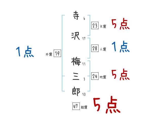 天運![]() | 寺沢梅三郎さんの天運は23画の5つ星!想像力に優れ活力がある。一代で成功し名誉を手に入れる。 家系が持つ宿命的な運勢を表します。祖先から受け継いだ苗字ですので自分の力が及びません。家柄を象徴します。 |
