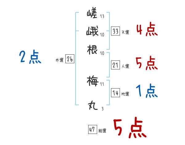 人運![]() | 嵯峨根梅丸さんの人運は21画の5つ星!統率力がある。独立し成功する。名誉を手に入れる。 性格や才能などを表す2番目に重要な運勢です。人間関係や協調性、社会的な成功に影響します。主に20歳から50歳ぐらいまでの中年期の運勢を表します。 |