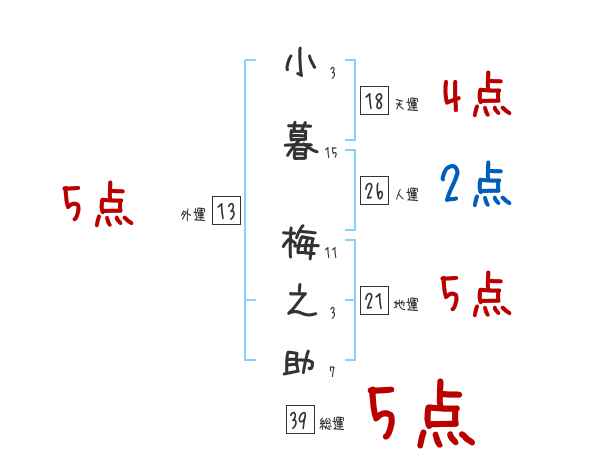 天運![]() | 小暮梅之助さんの天運は18画の4つ星!情熱的で剛気。忍耐力があり信頼される。 家系が持つ宿命的な運勢を表します。祖先から受け継いだ苗字ですので自分の力が及びません。家柄を象徴します。 |