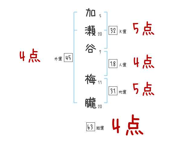 総運![]() | 加瀬谷梅朧さんの総運は63画の4つ星!家庭運がよく順調な生活。温和な性格。 あなたの人生を表す1番重要な運勢です。生涯を通じて影響する総合運となり、主に50歳以降の晩年期に影響を及ぼします。 |