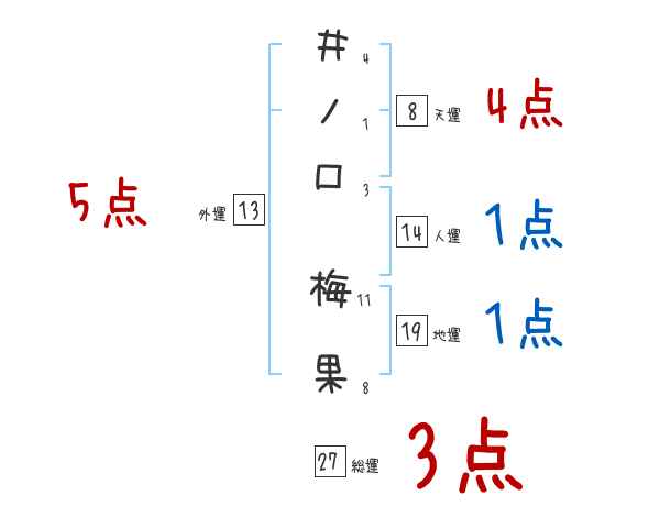 外運![]() | 井ノ口梅果さんの外運は13画の5つ星!才能に恵まれ人気がある。名声を手に入れる。円満な人生。 生活面を象徴する運勢です。外部から受ける影響力を表し、結婚運、家庭運や職場、環境への順応性を表します。 |
