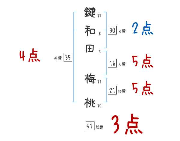 天運![]() | 鍵和田梅桃さんの天運は30画の2つ星!浮き沈みの激しさに注意しましょう。 家系が持つ宿命的な運勢を表します。祖先から受け継いだ苗字ですので自分の力が及びません。家柄を象徴します。 |