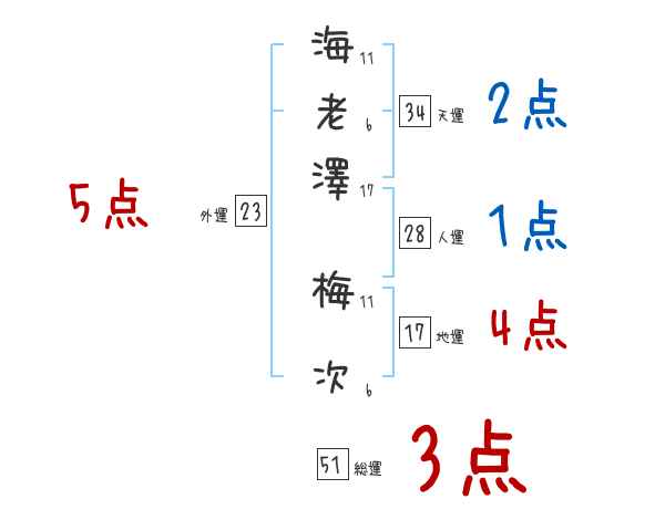 総運![]() | 海老澤梅次さんの総運は51画の3つ星!変化が激しく、危険に注意。堅実な性格。 あなたの人生を表す1番重要な運勢です。生涯を通じて影響する総合運となり、主に50歳以降の晩年期に影響を及ぼします。 |