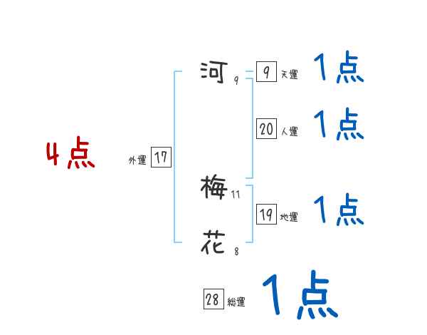 総運![]() | 河梅花さんの総運は28画の1つ星!家庭環境に注意。スポーツで活躍できる能力があるかも。 あなたの人生を表す1番重要な運勢です。生涯を通じて影響する総合運となり、主に50歳以降の晩年期に影響を及ぼします。 |