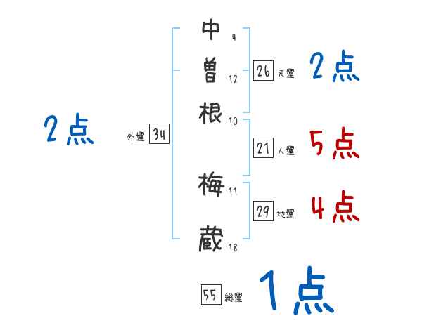 人運![]() | 中曽根梅蔵さんの人運は21画の5つ星!統率力がある。独立し成功する。名誉を手に入れる。 性格や才能などを表す2番目に重要な運勢です。人間関係や協調性、社会的な成功に影響します。主に20歳から50歳ぐらいまでの中年期の運勢を表します。 |