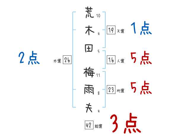総運![]() | 荒木田梅雨夫さんの総運は42画の3つ星!病気に注意。多芸であるが消極的でおとなしい。 あなたの人生を表す1番重要な運勢です。生涯を通じて影響する総合運となり、主に50歳以降の晩年期に影響を及ぼします。 |