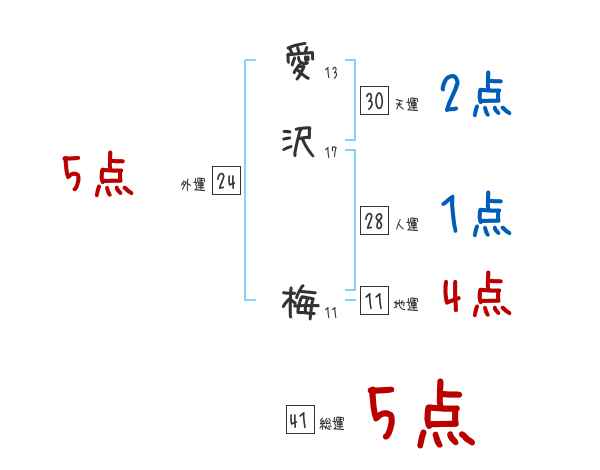 天運![]() | 愛沢梅さんの天運は30画の2つ星!浮き沈みの激しさに注意しましょう。 家系が持つ宿命的な運勢を表します。祖先から受け継いだ苗字ですので自分の力が及びません。家柄を象徴します。 |