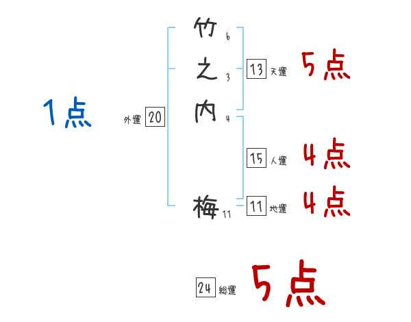 総運![]() | 竹之内梅さんの総運は24画の5つ星!家庭運が良く順調な人生。金運にも恵まれる。 あなたの人生を表す1番重要な運勢です。生涯を通じて影響する総合運となり、主に50歳以降の晩年期に影響を及ぼします。 |