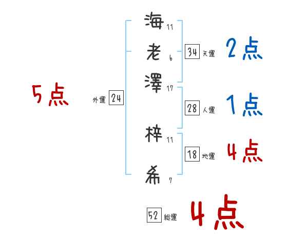 総運![]() | 海老澤梓希さんの総運は52画の4つ星!先見性と独創性に優れ考える力がある。強運の持ち主。 あなたの人生を表す1番重要な運勢です。生涯を通じて影響する総合運となり、主に50歳以降の晩年期に影響を及ぼします。 |
