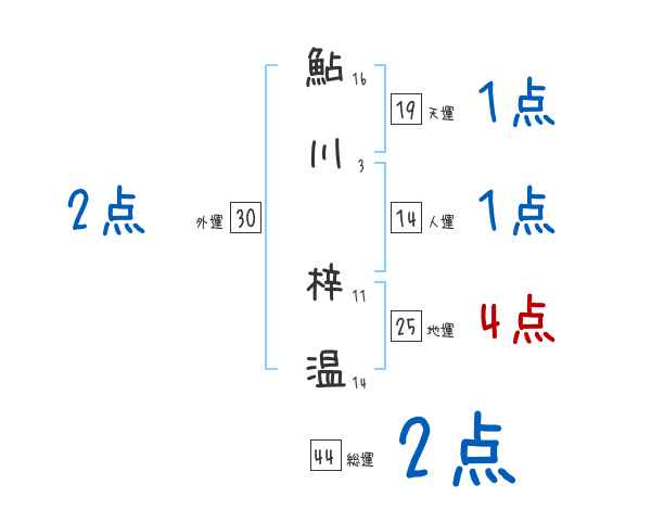 天運![]() | 鮎川梓温さんの天運は19画の1つ星!優れた才能を持ちますが、協調性が足りないことも。周りの人と協力する事を意識しましょう。 家系が持つ宿命的な運勢を表します。祖先から受け継いだ苗字ですので自分の力が及びません。家柄を象徴します。 |