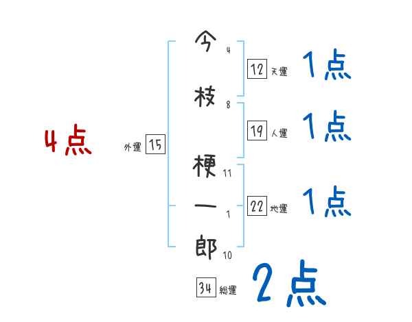 天運![]() | 今枝梗一郎さんの天運は12画の1つ星!簡単な失敗で諦めてしまいやすいかも。着実に行動すると良いでしょう。 家系が持つ宿命的な運勢を表します。祖先から受け継いだ苗字ですので自分の力が及びません。家柄を象徴します。 |