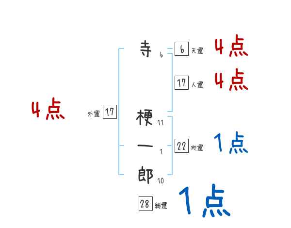 天運![]() | 寺梗一郎さんの天運は6画の4つ星!慎重な努力家で信頼を得る。誠実な精神で向上心に優れる。 家系が持つ宿命的な運勢を表します。祖先から受け継いだ苗字ですので自分の力が及びません。家柄を象徴します。 |