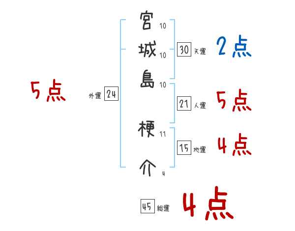 天運![]() | 宮城島梗介さんの天運は30画の2つ星!浮き沈みの激しさに注意しましょう。 家系が持つ宿命的な運勢を表します。祖先から受け継いだ苗字ですので自分の力が及びません。家柄を象徴します。 |