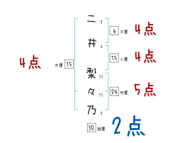 総運![]() | 二井梨々乃さんの総運は30画の2つ星!浮き沈みの激しさに注意しましょう。 あなたの人生を表す1番重要な運勢です。生涯を通じて影響する総合運となり、主に50歳以降の晩年期に影響を及ぼします。 |