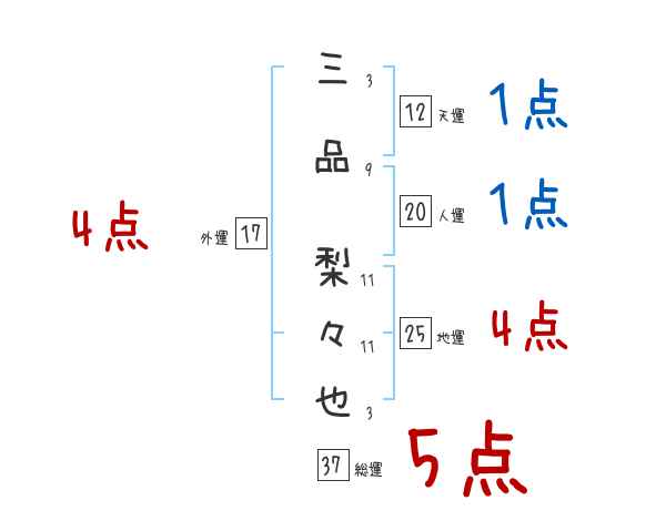 | 人運  | 三品梨々也さんの人運は20画の1つ星!社交が苦手。人とは違った才能があり波乱万丈な人生かも。性格や才能などを表す2番目に重要な運勢です。人間関係や協調性、社会的な成功に影響します。主に20歳から50歳ぐらいまでの中年期の運勢を表します。 |