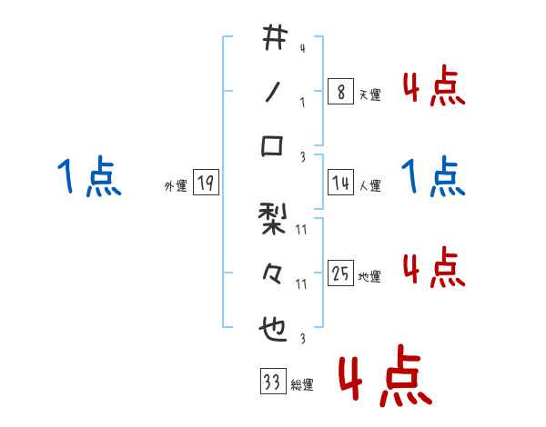 総運![]() | 井ノ口梨々也さんの総運は33画の4つ星!権力志向でプライドが高い。勇気があり運を切り開き成功する。 あなたの人生を表す1番重要な運勢です。生涯を通じて影響する総合運となり、主に50歳以降の晩年期に影響を及ぼします。 |