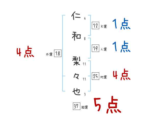 外運![]() | 仁和梨々也さんの外運は18画の4つ星!情熱的で剛気。忍耐力があり信頼される。 生活面を象徴する運勢です。外部から受ける影響力を表し、結婚運、家庭運や職場、環境への順応性を表します。 |