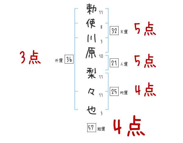 天運![]() | 勅使川原梨々也さんの天運は32画の5つ星!柔軟性があり成功する。チャンスが多く金運が良い。 家系が持つ宿命的な運勢を表します。祖先から受け継いだ苗字ですので自分の力が及びません。家柄を象徴します。 |